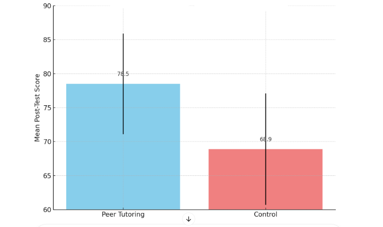 Figure 1 visually depicts the difference in post-test mathematics scores between the Peer Tutoring and Control groups. The chart shows that the peer-tutored students not only achieved higher average scores but also exhibited slightly less variability in performance.