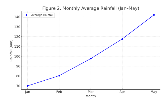 As shown in Figure 2, monthly rainfall amounts increased steadily from January to May, peaking at 142 mm. The sharpest rise was observed between March and April. The complete set of rainfall data for all locations and months is presented in Table 3.