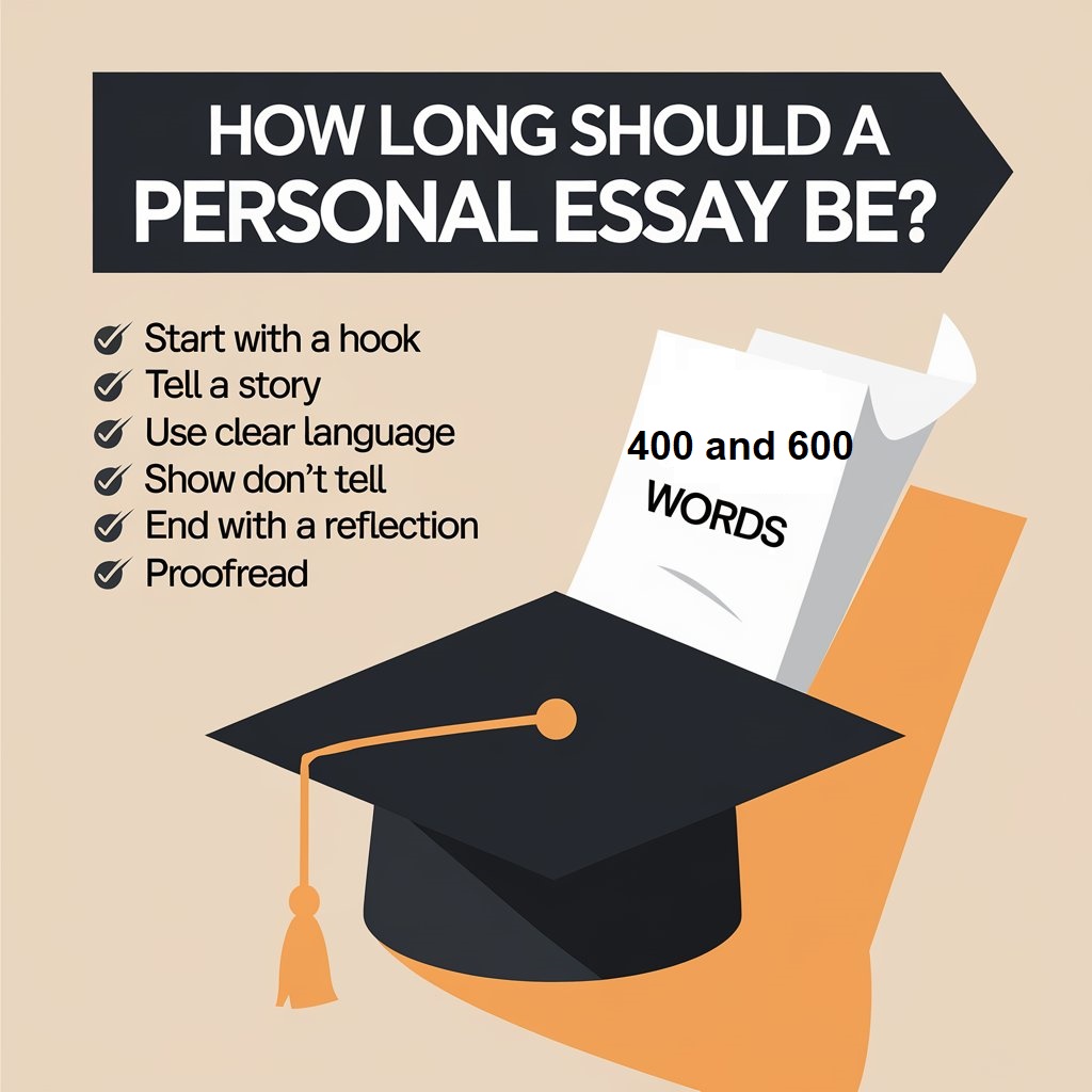- A personal Essay generally ranges from 400 to 600 words. It’s important to thoroughly review the prompt and adhere to all the guidelines outlined in the application. If no guideline is given, write 400 to 600 words, which is standard for many colleges.
