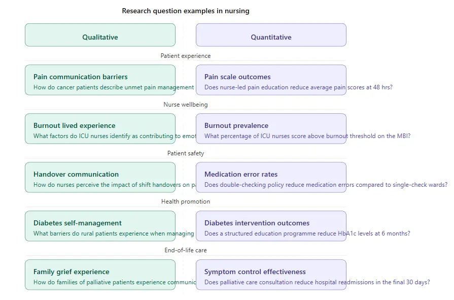 Use qualitative research when exploring patient experiences, understanding cultural influences on health, identifying barriers to healthcare access, or developing new nursing theories. Examples include understanding why patients don’t adhere to treatments, exploring the lived experience of new mothers, or examining nurses’ ethical decision-making processes.