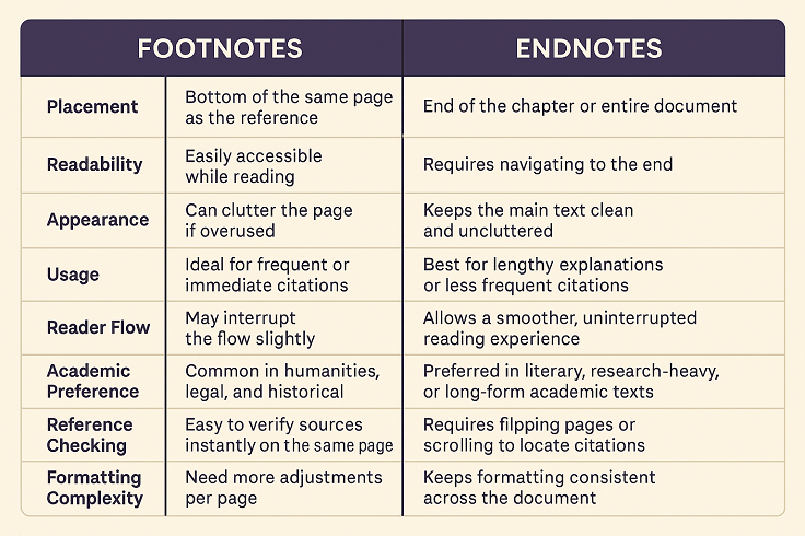 Footnotes and endnotes are essential tools in academic and professional writing, each serving the purpose of enhancing clarity, providing citations, and offering additional insight. While both formats help support your arguments and credit sources, the choice between them depends on factors such as discipline, document length, formatting preferences, and readability. Footnotes are ideal for immediate reference and accessibility, especially in humanities and legal writing. On the other hand, endnotes help maintain a clean layout and are better suited for longer, in-depth explanations typically found in literary and research-heavy texts.